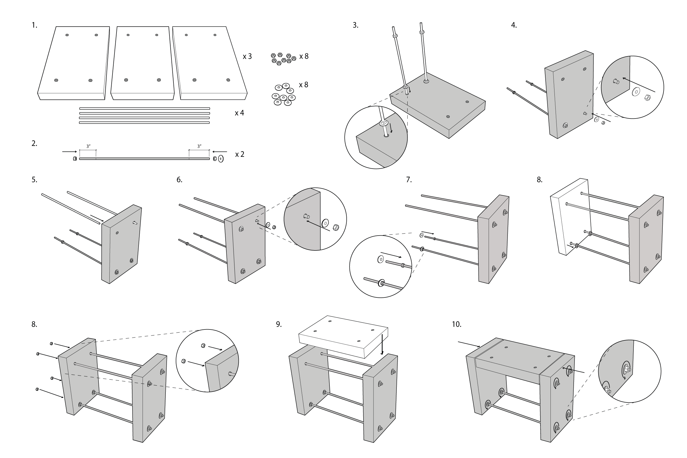 Le mobilier se constitue de trois dalles en béton identiques pesant 45lbs chacune, perforées de quatre ouvertures pour ainsi accueillir quatre tiges filetées liant l’ensemble par des boulons. La partie centrale est fixée en resserrant les boulons sur les dalles latérales dont celles-ci prennent en tenaille l’assise.